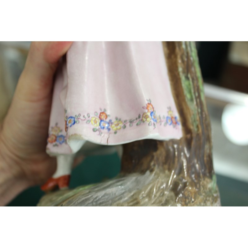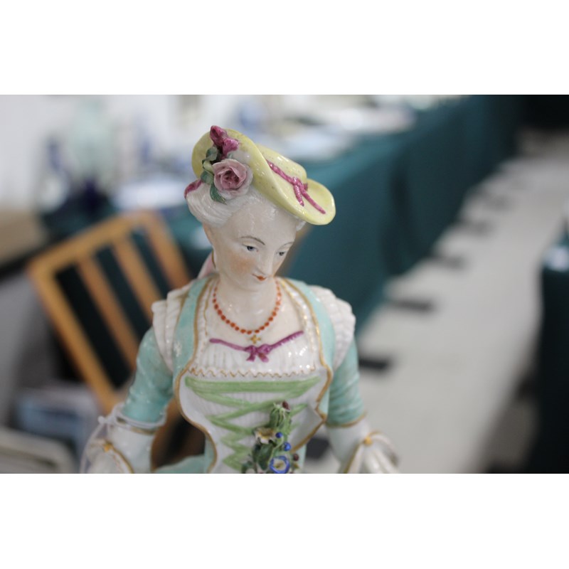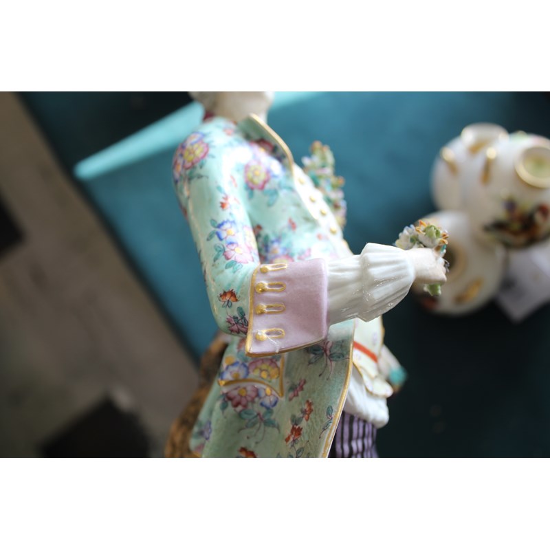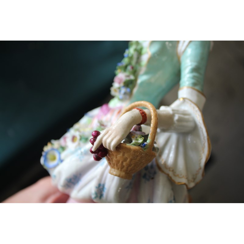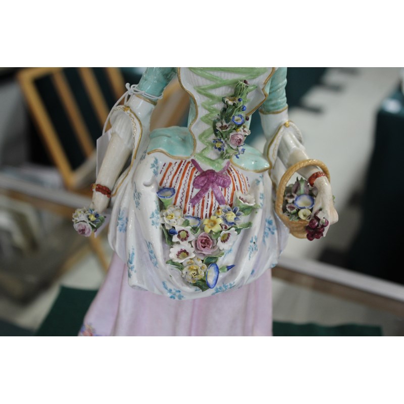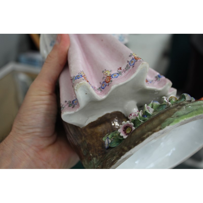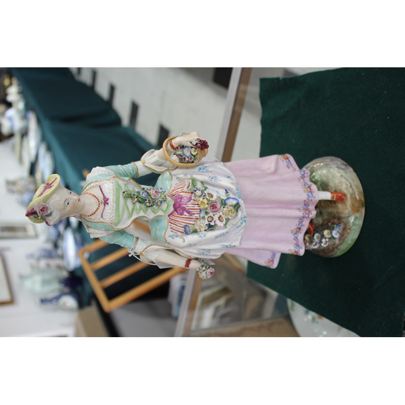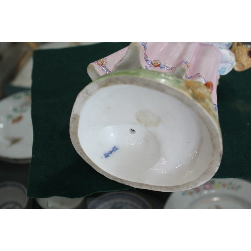 late 19th century, applied with two cherubs and floral encrustations, height 34cm; together with a pair of French porcelain figures, probably Montreuil, of an elegant couple, blue factory marks, height 37cm (3)