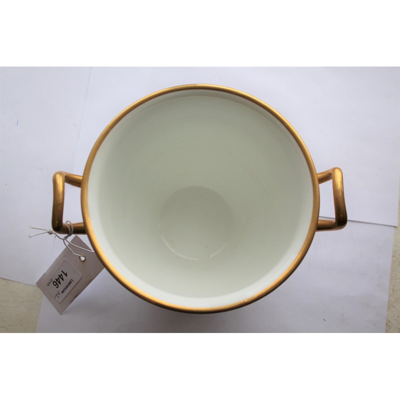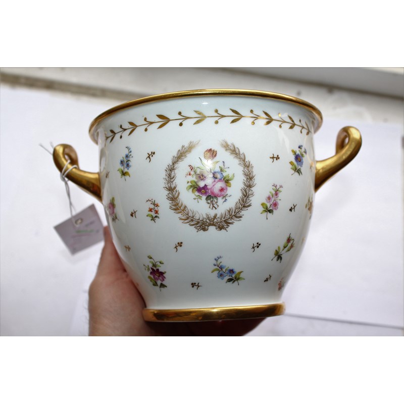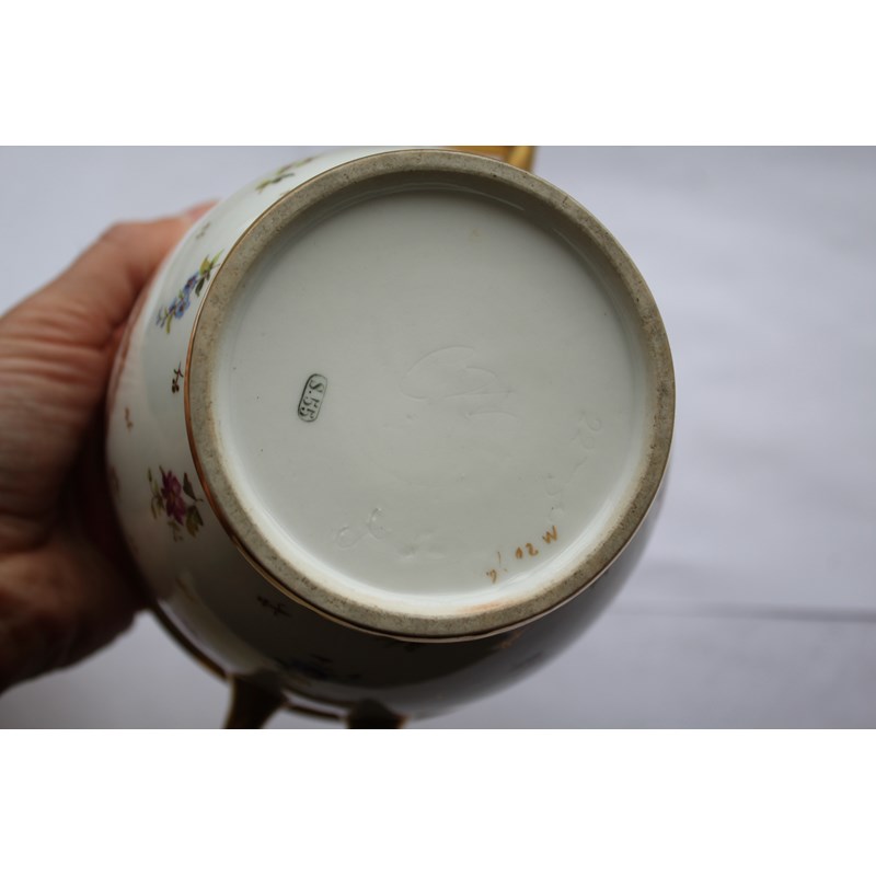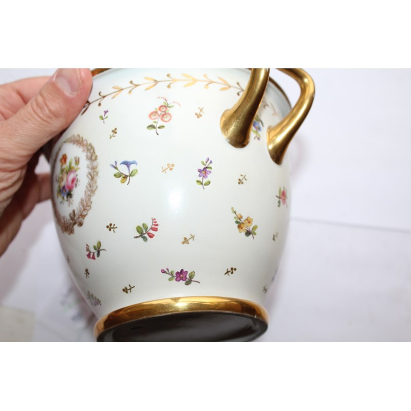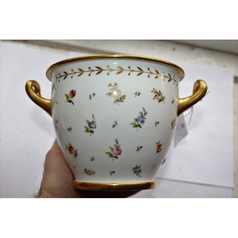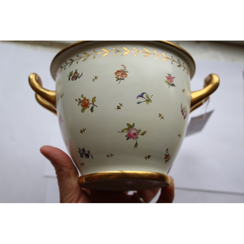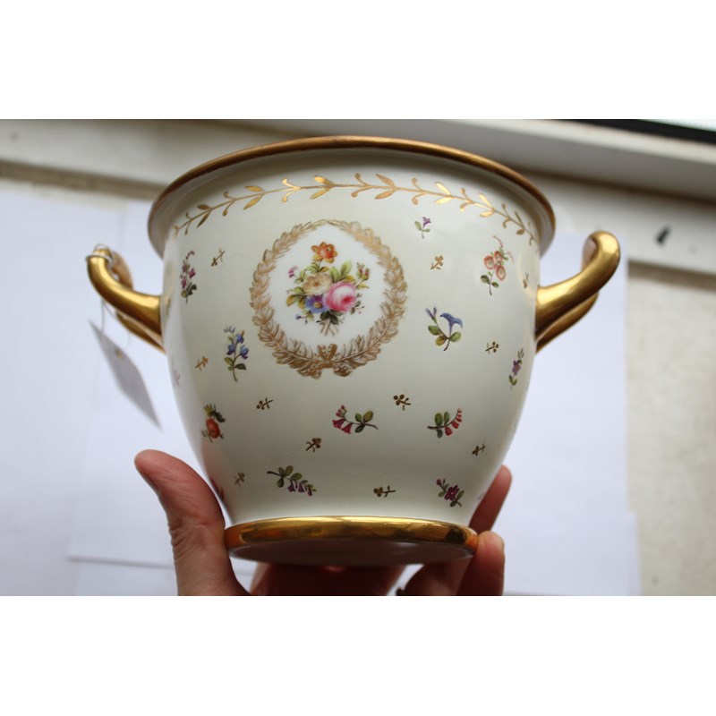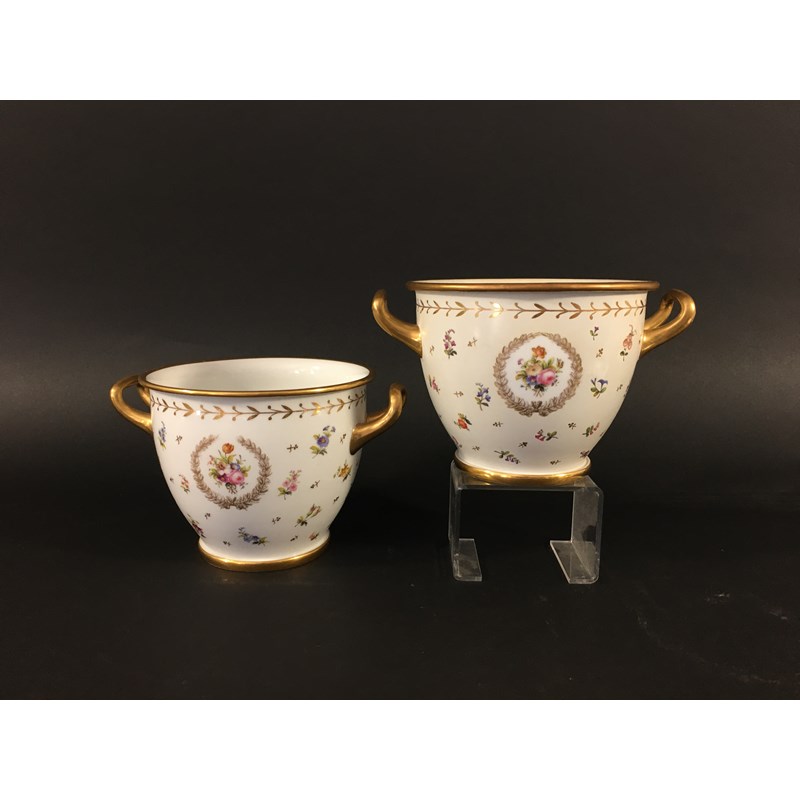 PAIR OF SEVRES CACHE POTS mid 19th century, of two handled form and painted with scattered flowers, green S.55, height 13cm, width 20cm (2)
