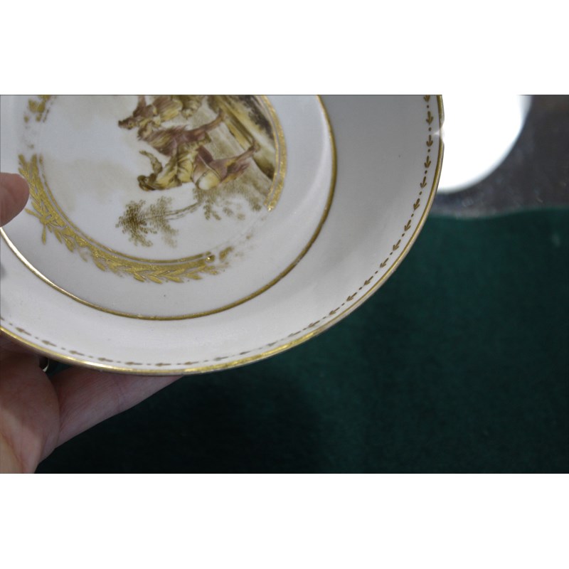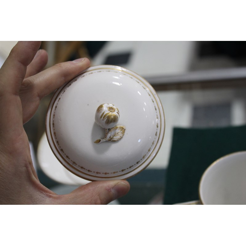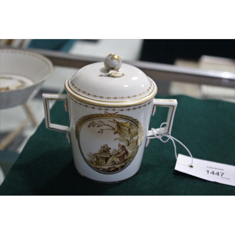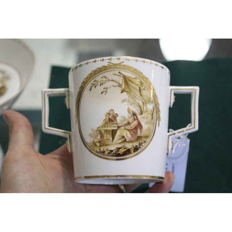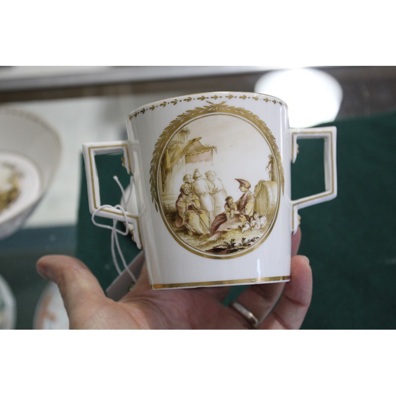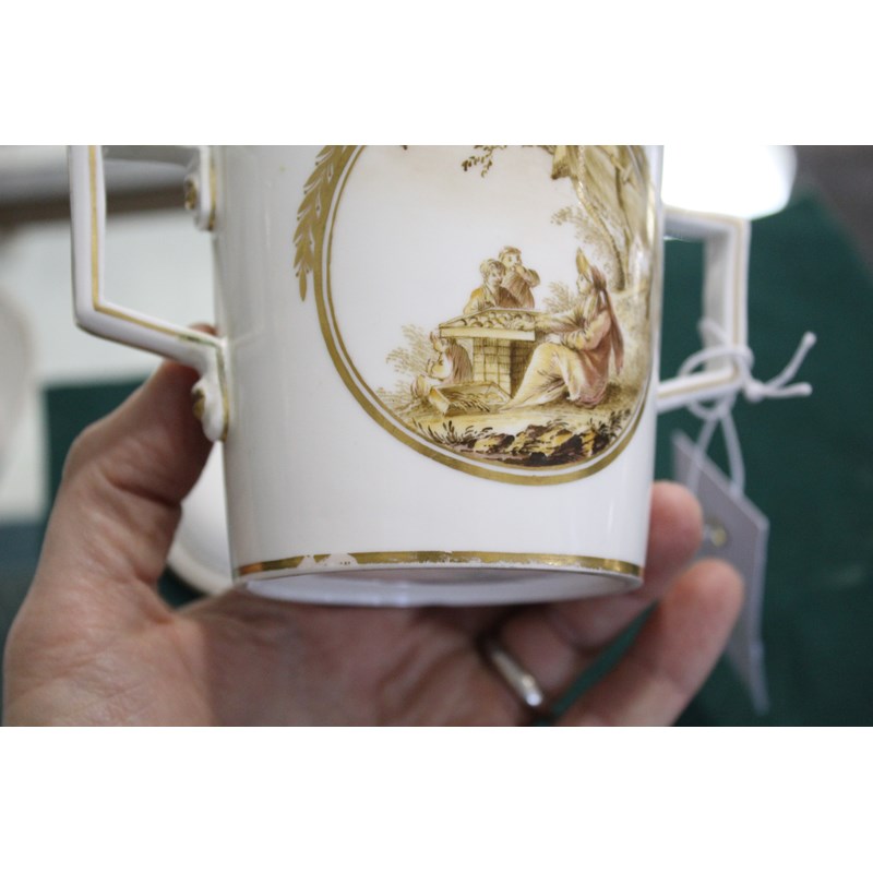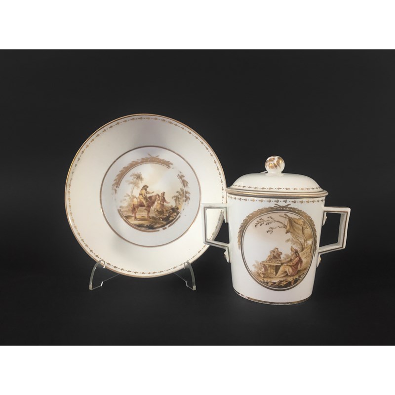 GOTHA PORCELAIN CHOCOLATE CUP, COVER AND SAUCER late 18th century, of tapering, two handled form, painted in sepia tones with circular rustic scenes inside gilt borders, with apple finial, height 13cm