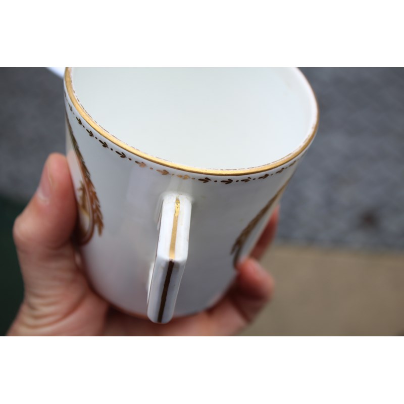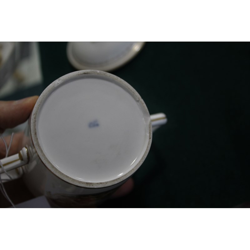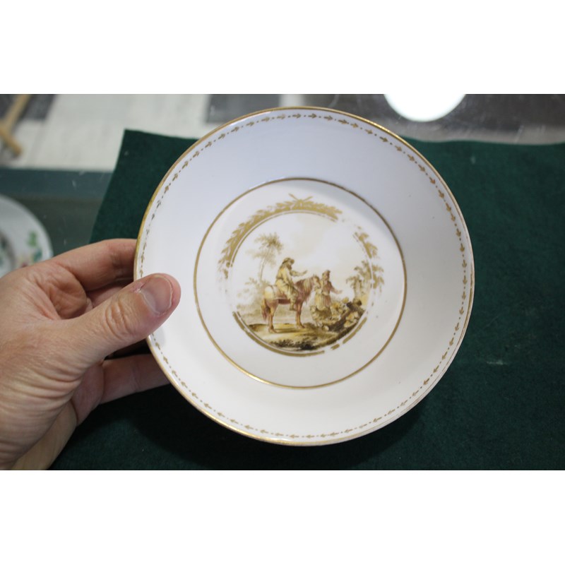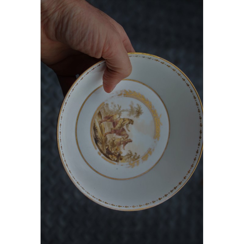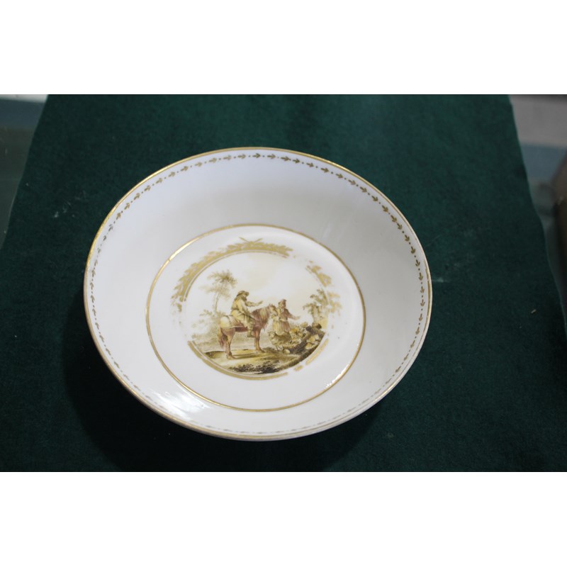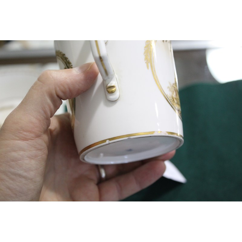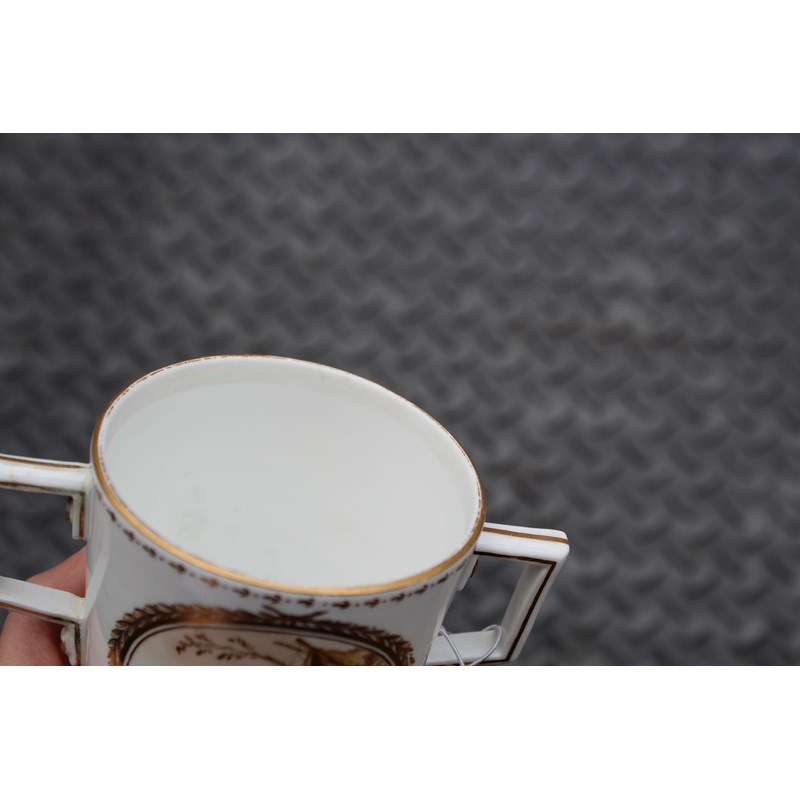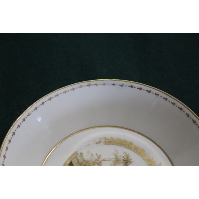GOTHA PORCELAIN CHOCOLATE CUP, COVER AND SAUCER late 18th century, of tapering, two handled form, painted in sepia tones with circular rustic scenes inside gilt borders, with apple finial, height 13cm