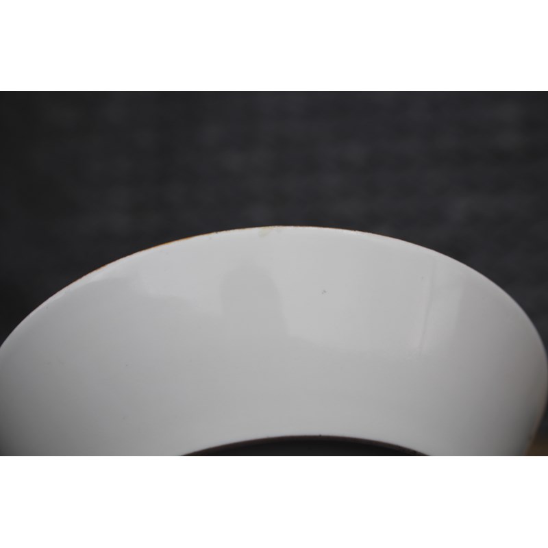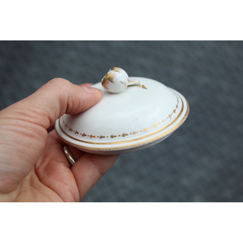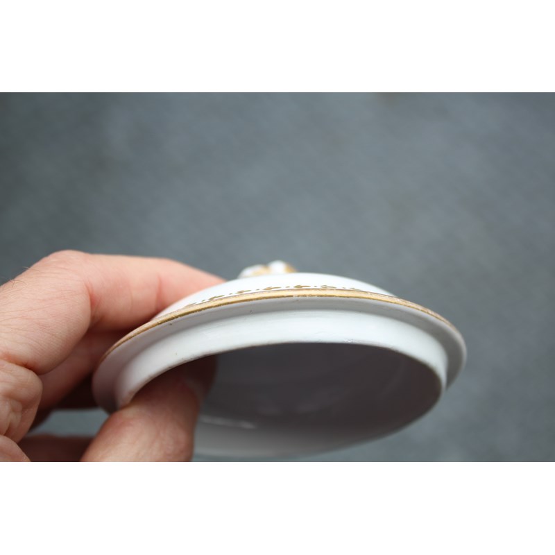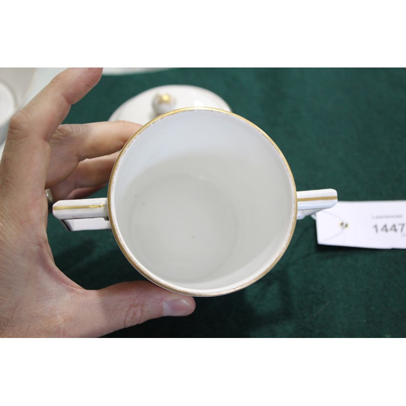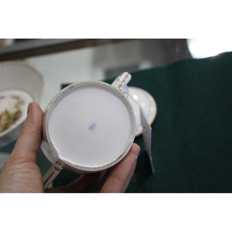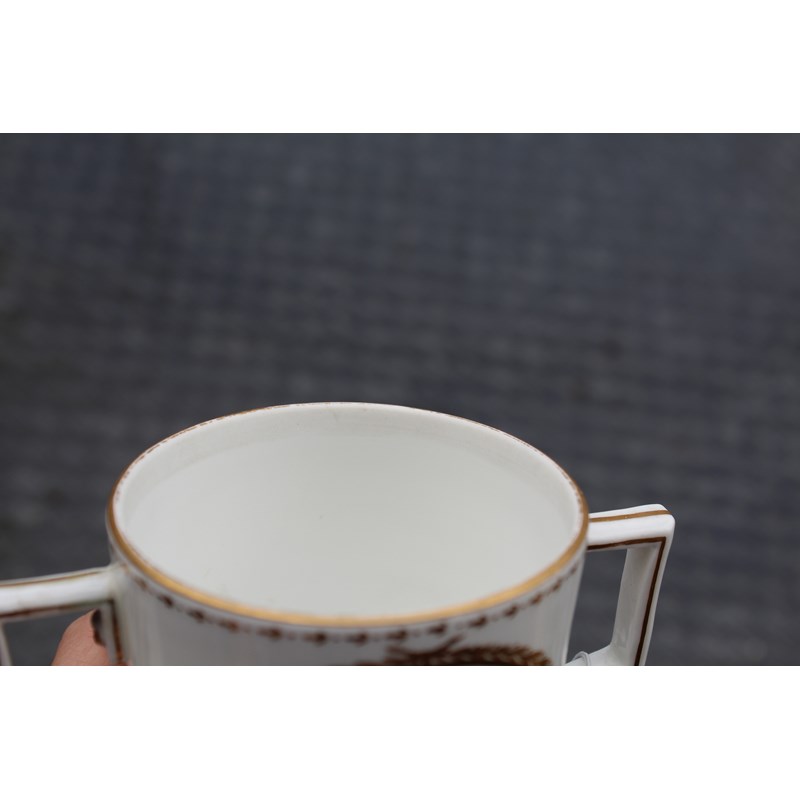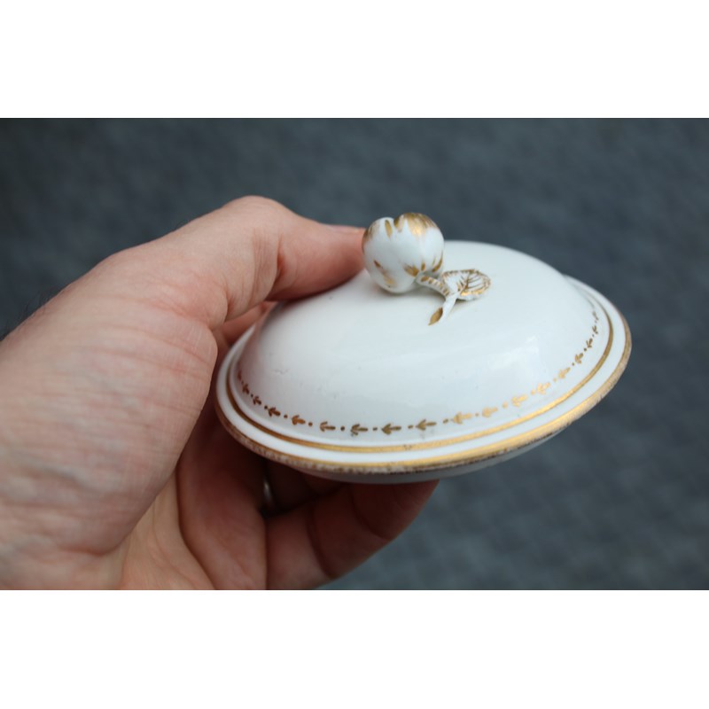 GOTHA PORCELAIN CHOCOLATE CUP, COVER AND SAUCER late 18th century, of tapering, two handled form, painted in sepia tones with circular rustic scenes inside gilt borders, with apple finial, height 13cm