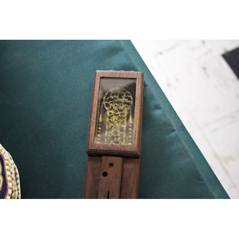 19th century, the brass skeletonised dial with floral piercing on a short duration verge movement with wavy balance wheel, the weight with a bell enclosed, in a rosewood type case pierced brass sides, with key drawer and key, height 44cm