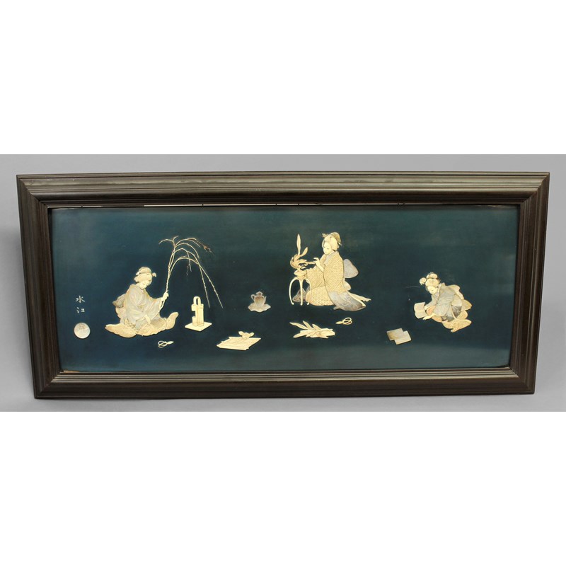 Meiji, with three maidens at various activities in mother of pearl and ivory, two character inscription and circular mother of pearl plaque, 38cm x 105cm