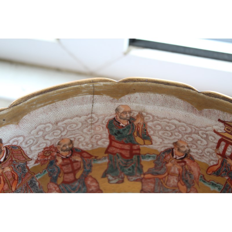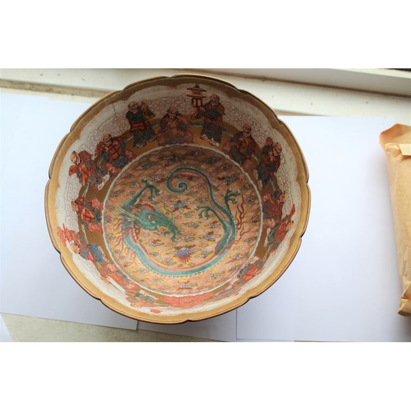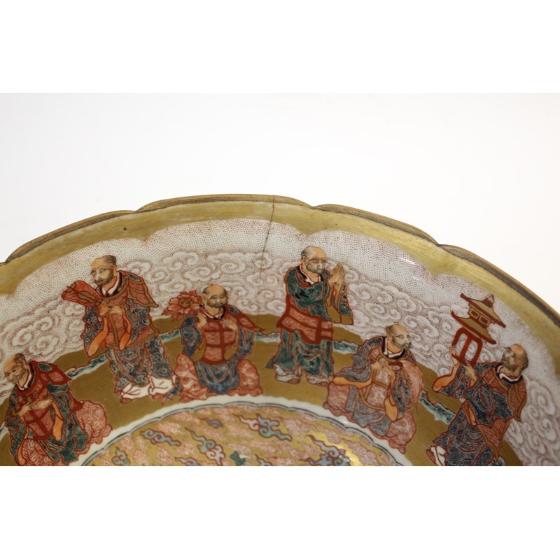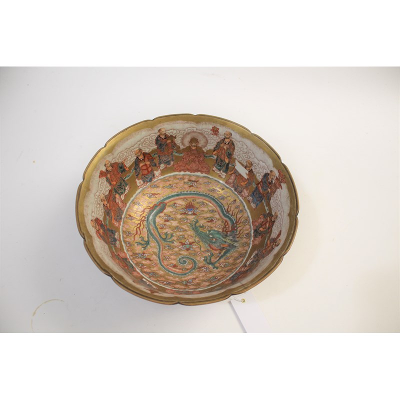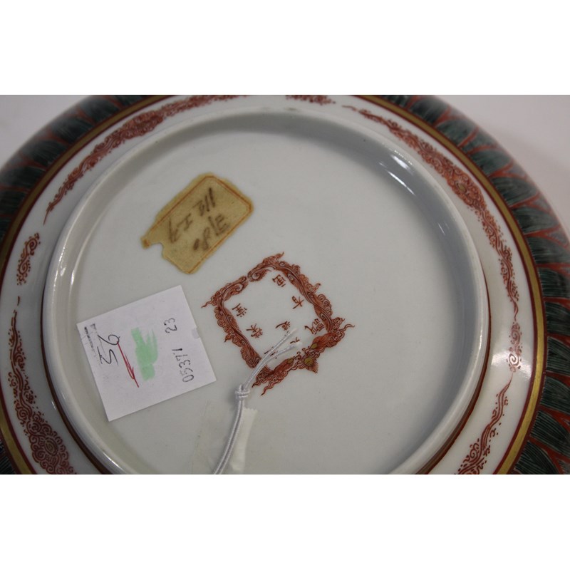 later 19th century, the interior painted with buddhistic men around a priest or lama centred by a dragon, the exterior similarly decorated, iron red seven character signature in a cartouche, diameter 27.5cm