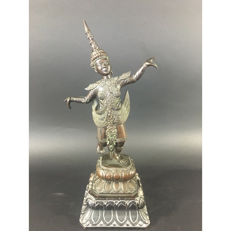 SOUTH EAST ASIAN FIGURE perhaps Java or Thai, standing with arms outstretched, on a lotus base and stand, height excluding stand 40cm; and a smaller group of two dancers, height 13cm (3)