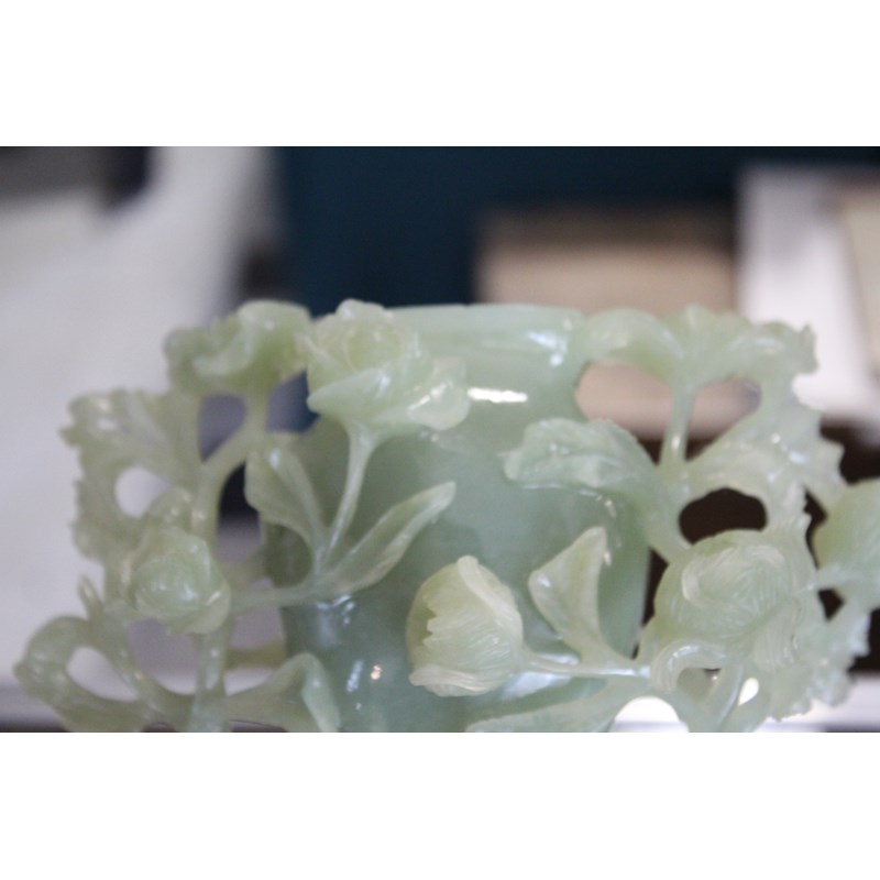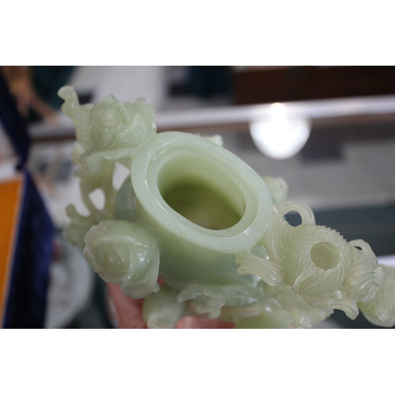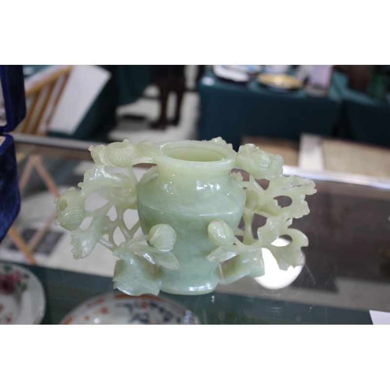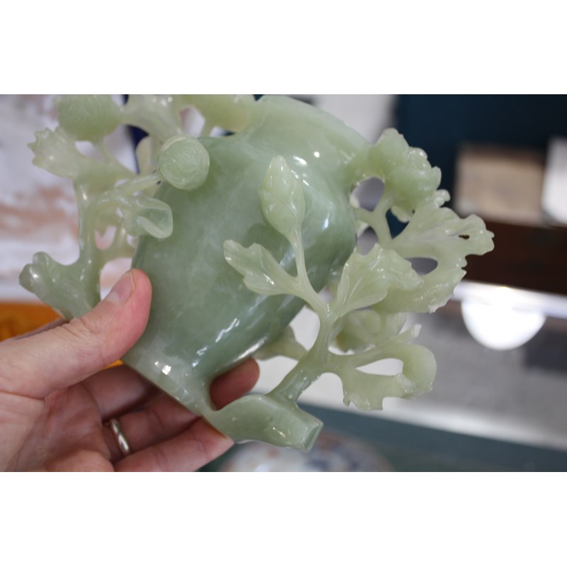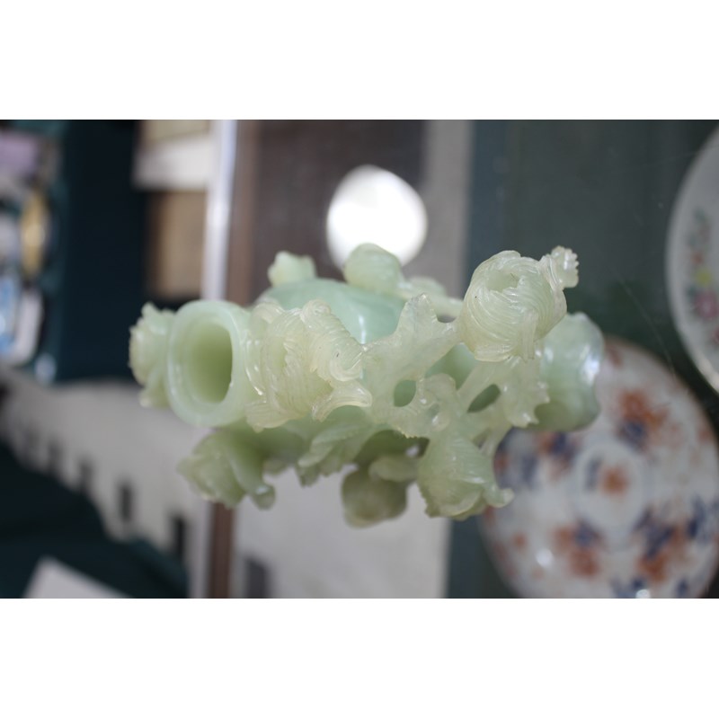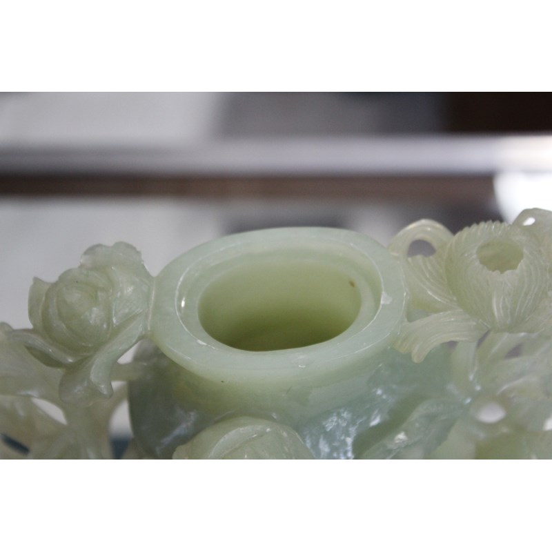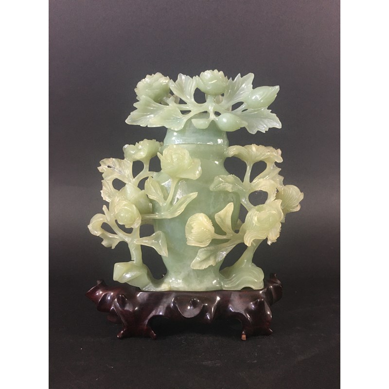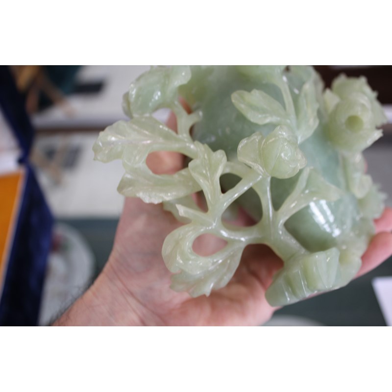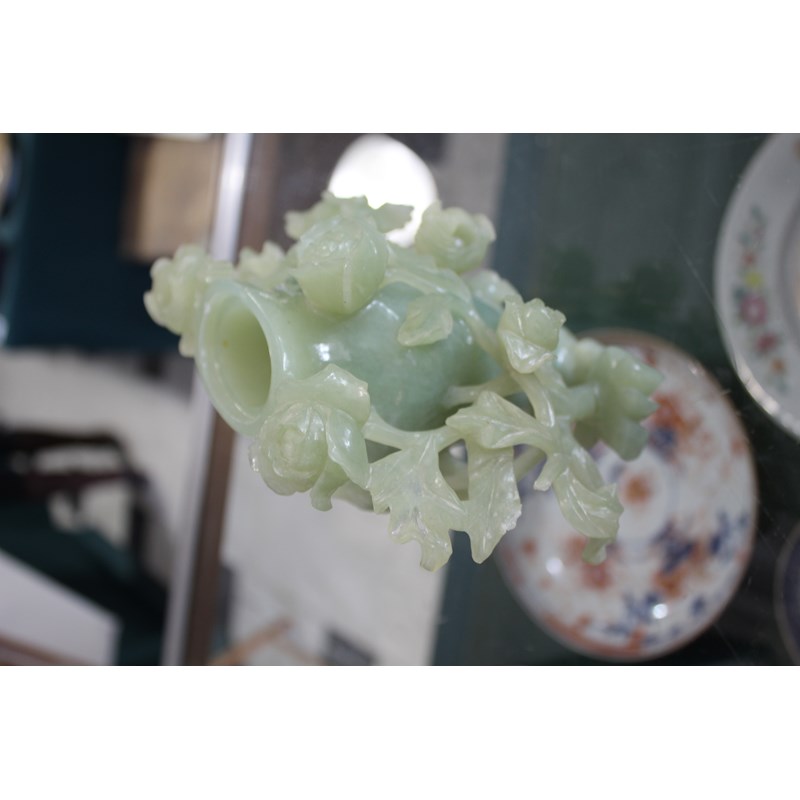CHINESE GREEN JADE VASE 20th century, carved with flowering foliage, on a hardwood stand, height including stand 23cm (boxed)