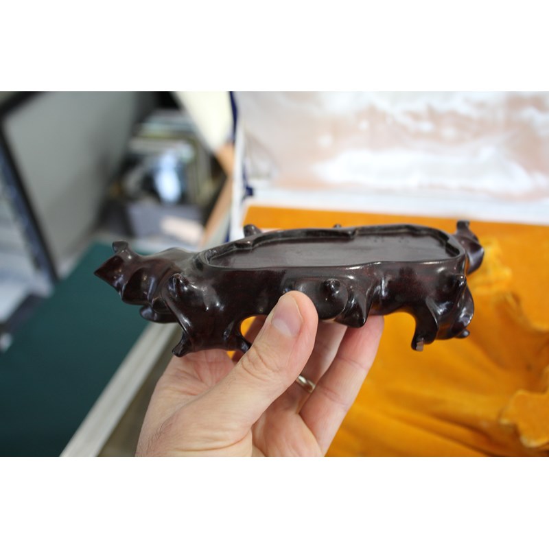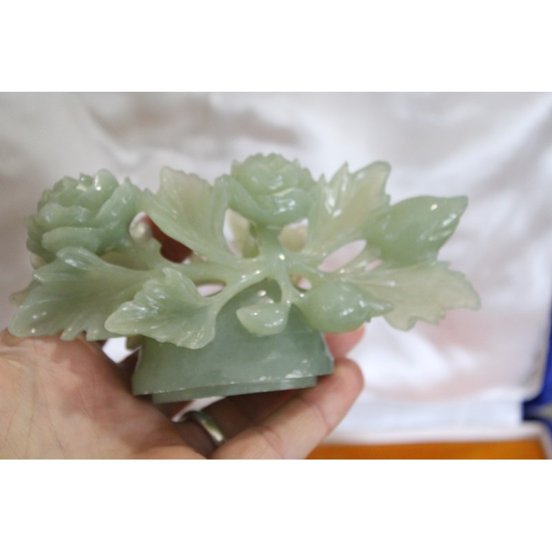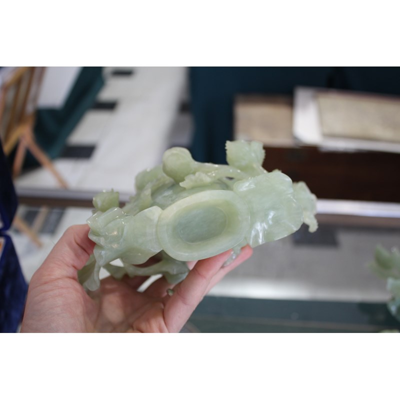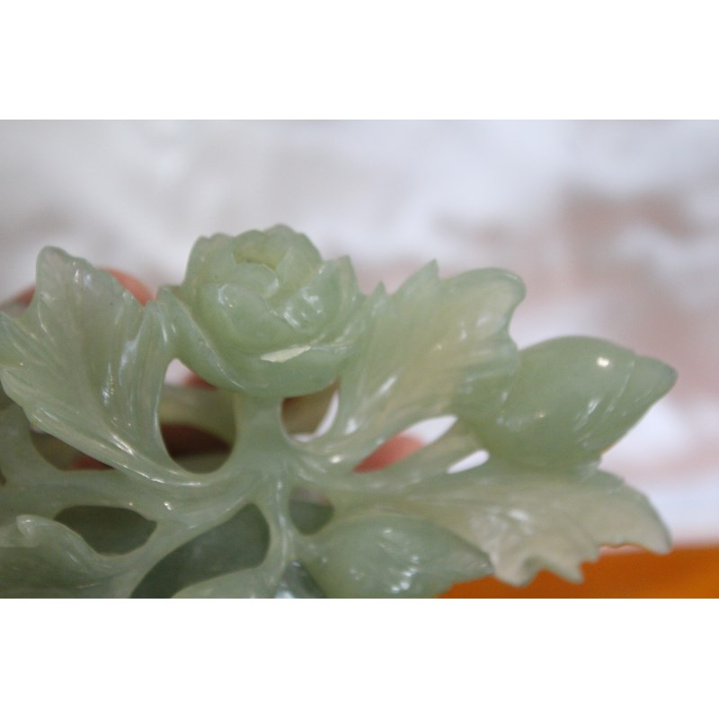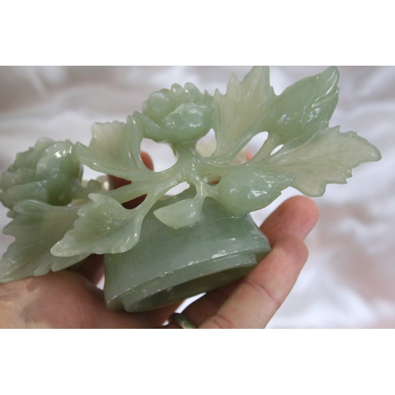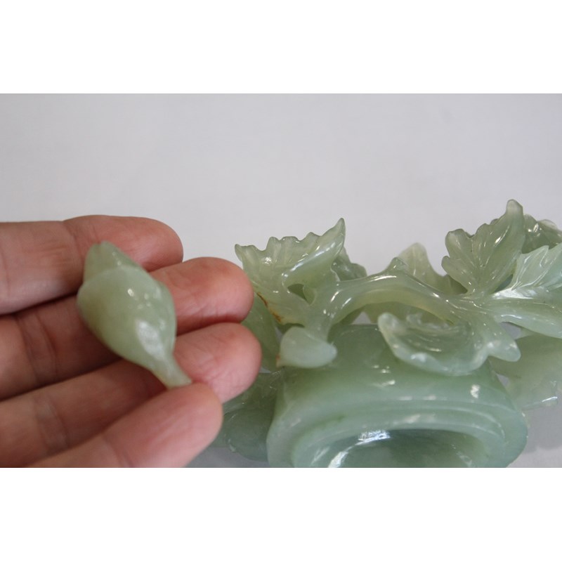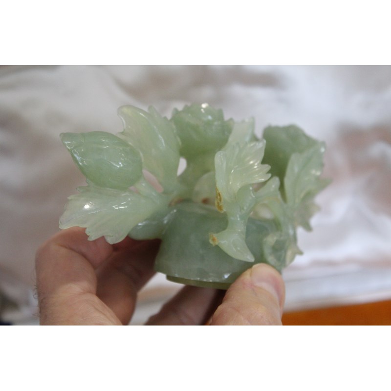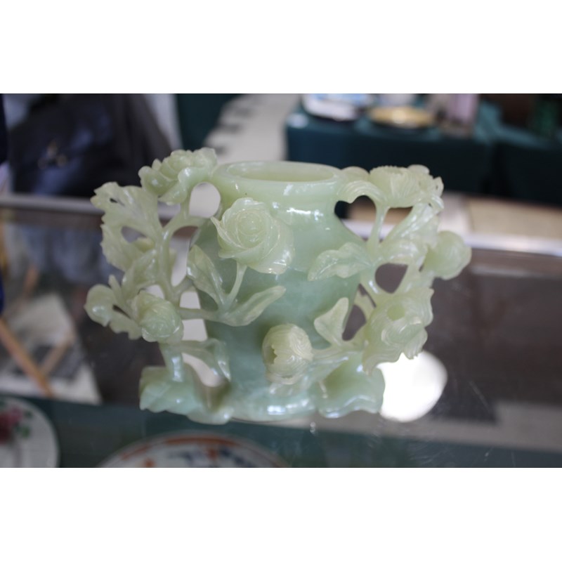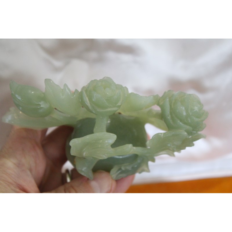 CHINESE GREEN JADE VASE 20th century, carved with flowering foliage, on a hardwood stand, height including stand 23cm (boxed)