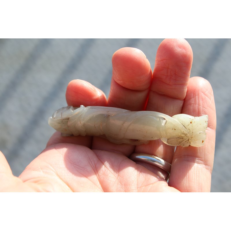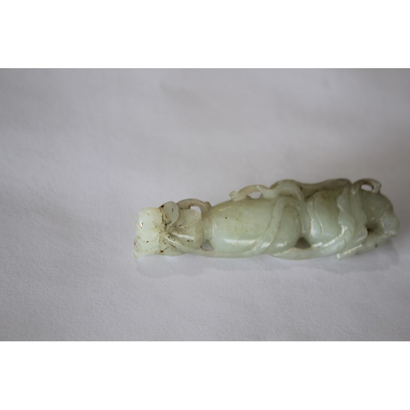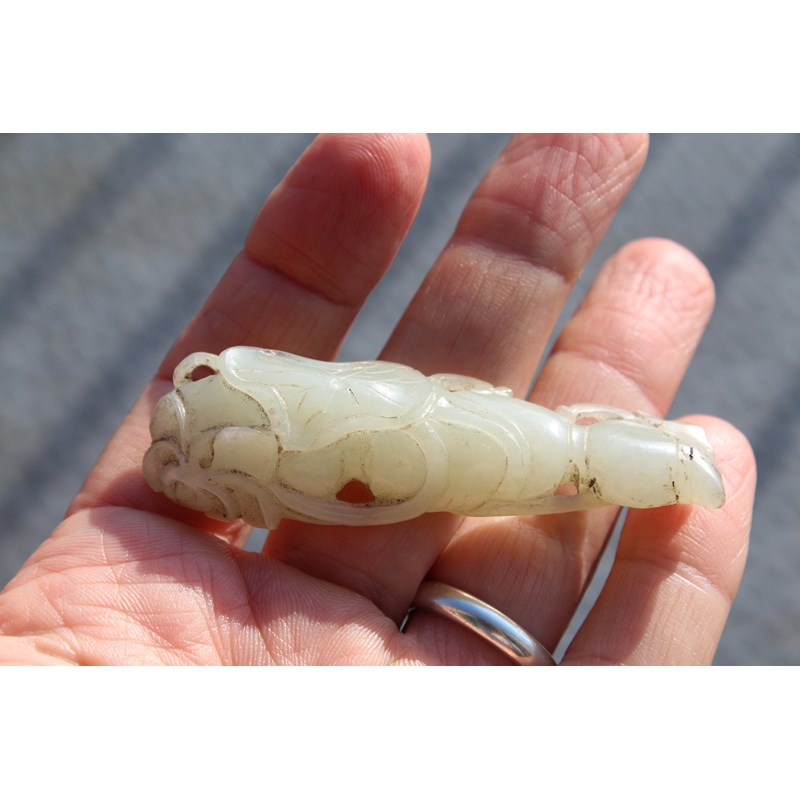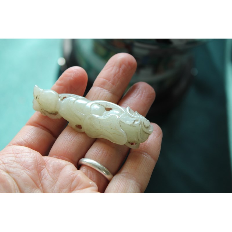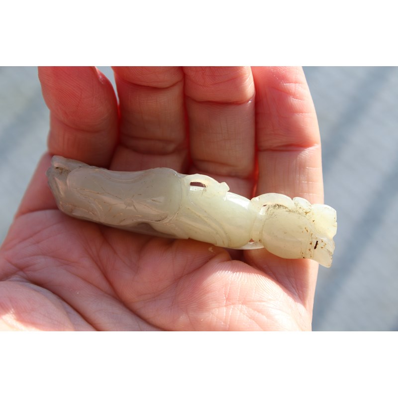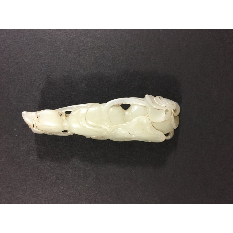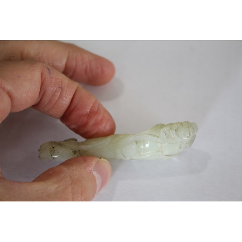 CHINESE PALE CELADON JADE PENDANT carved with lotus flowers and fruit, length 7.3cm