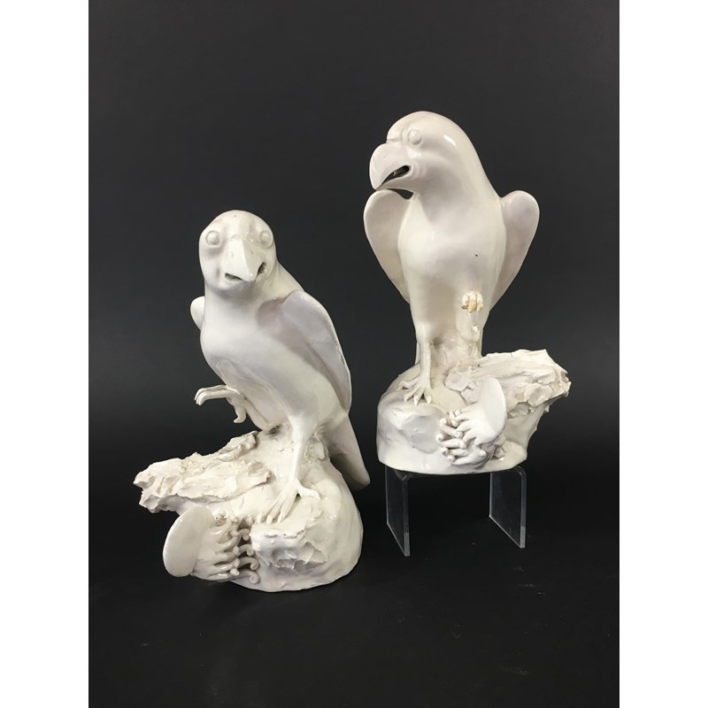PAIR OF CHINESE DEHUA STYLE PARROTS probably 19th century, in white, modelled standing on a rock above a squid or finger citron, height 20cm (2)