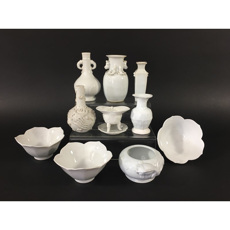 COLLECTION OF BLANC DE CHINE various dates, including flower shaped bowls, a vase with chilong to the shoulders, another with a koi carp in relief and other vases, height 12.5cm and smaller (11)