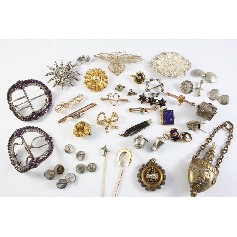 including a gold horseshoe stick pin, a cultured pearl and gold brooch, a garnet and gilt metal brooch, a cultured pearl and rose-cut diamond circle brooch, a turquoise and half pearl insect brooch, a cultured pearl and gold bow brooch, a pair of paste set buckles, a paste set star brooch and various other items