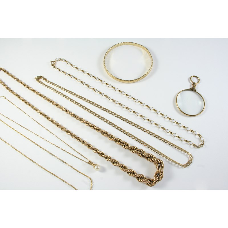 53cm long, 14.7 grams, a 9ct gold bangle, 18.7 grams, a 9ct gold flat curb link necklace, 43.5cm long, 8.5 grams, a cultured pearl and 9ct gold pendant, on a 9ct gold chain, weight of chain 1.6 grams, a 9ct. gold chain, 5.1 grams, and a magnifying glass