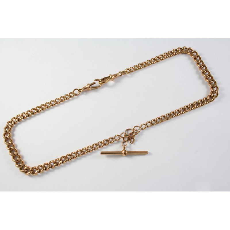 A 9CT GOLD CURB LINK WATCH CHAIN each link stamped 9 375, suspending a 9ct gold 't' bar, 45cm long, 52.6 grams