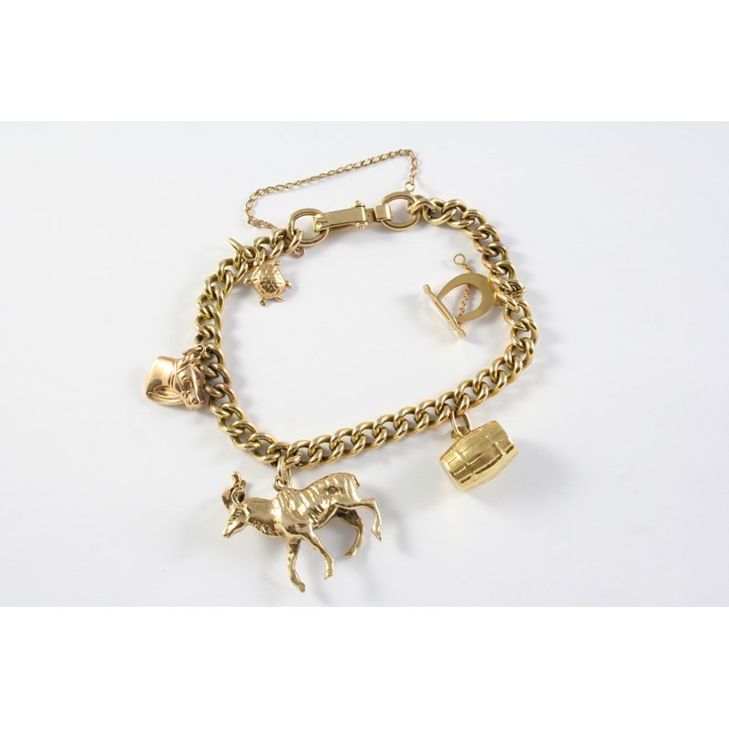 A 9CT GOLD CURB LINK BRACELET suspending five assorted charms, total weight 31.3 grams