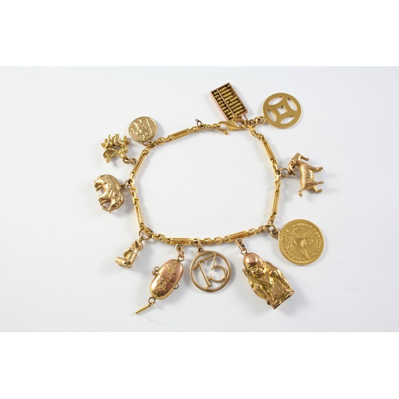 A GOLD CHARM BRACELET suspending assorted gold charms, total weight 26 grams
