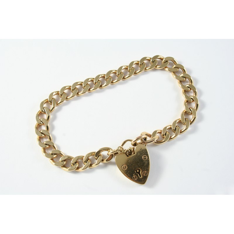 A 9CT GOLD FLAT CURB LINK BRACELET with padlock clasps, each link stamped 375, 19.5cm long, 26 grams