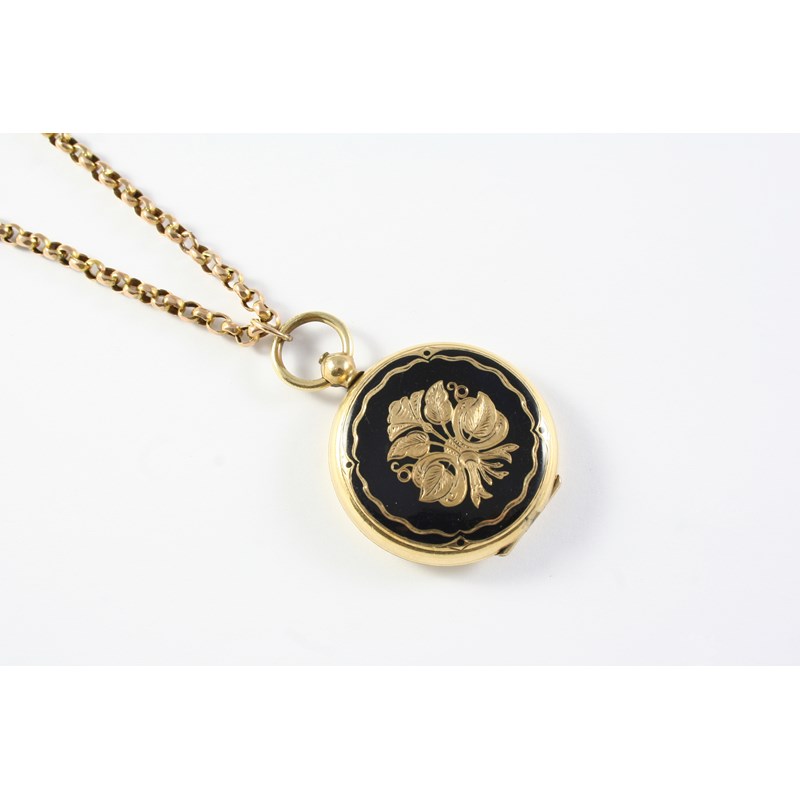 A 9CT GOLD CHAIN suspending a circular gold locket pendant, with black enamel and gold foliate decoration to the front case, engraved foliate decoration to the back case, the chain 58cm long, total weight 35.6 grams