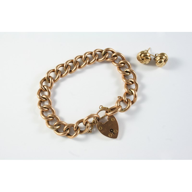 with padlock clasp, each link stamped 9ct, 18.5cm long, 18.9 grams, together with a pair of 9ct gold knot earrings, 2.5 grams
