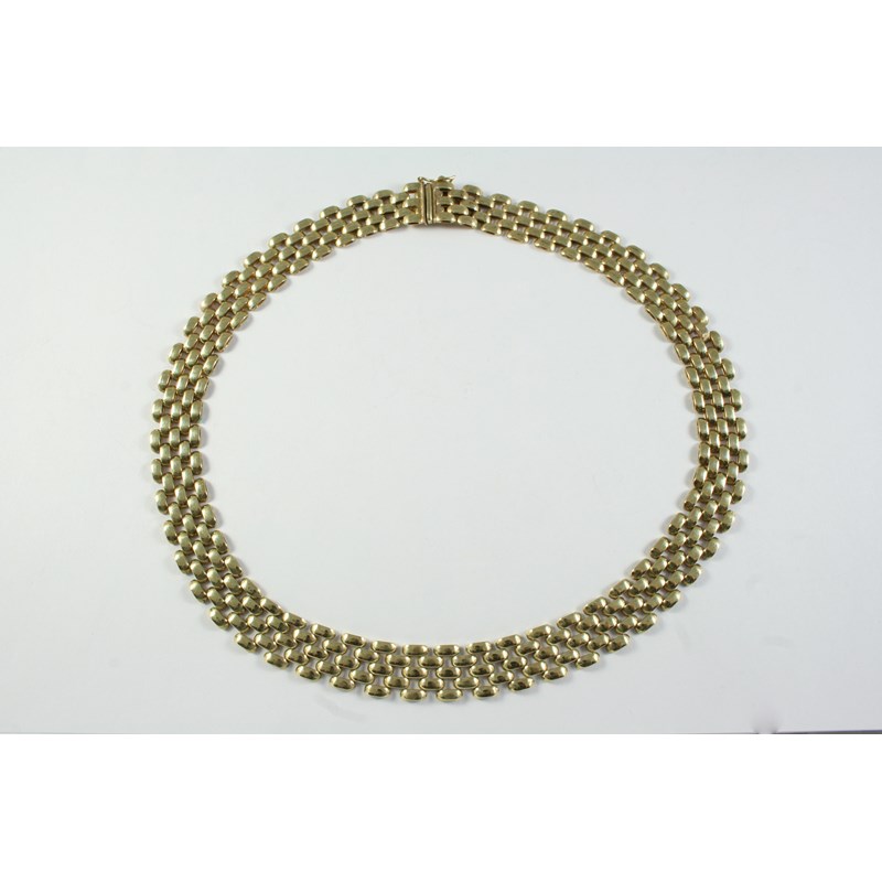 A 9CT GOLD FANCY LINK COLLAR NECKLACE with concealed clasp, 42cm long, 34.8 grams