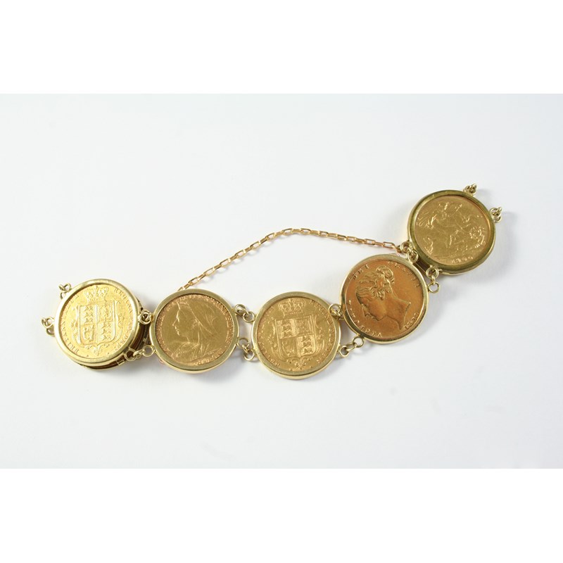 A GOLD HALF SOVEREIGN BRACELET formed as seven half sovereigns in gold mounts, 1859, 1863, 1883, two for 1899, 1900 and 1901, 18.5cm long, total weight 35.8 grams