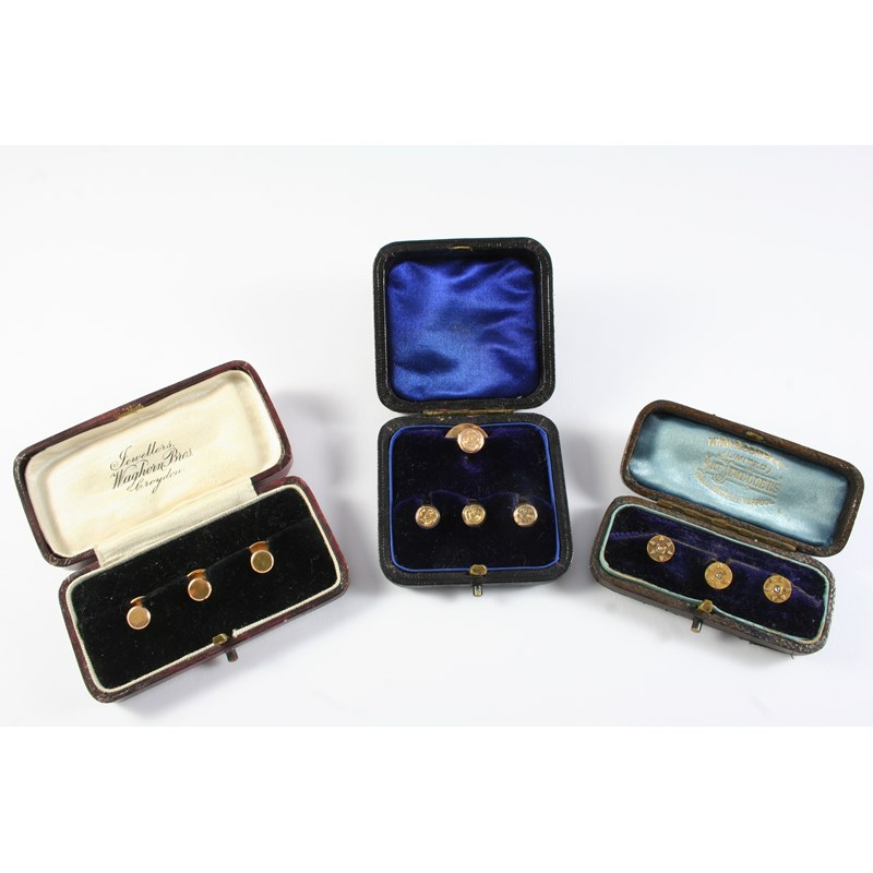 A SET OF FOUR 9CT GOLD DRESS BUTTONS each with engraved foliate decoration, together with a set of three 15ct gold dress buttons, of plain form and a set of three 15ct gold and rose-cut diamond dress buttons