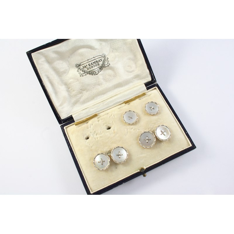 A PAIR OF MOTHER-OF-PEARL AND GOLD CUFFLINKS each mother-of-pearl disc is set in 9ct gold, together with two matching dress buttons