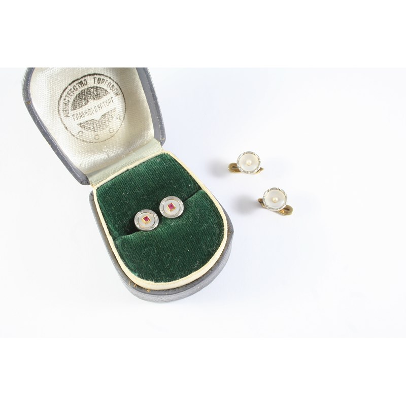 each mother of pearl disc is centred with a square-shaped ruby in gold, with Russian marks to the reverse, together with a pair of mother of pearl and pearl dress buttons, set in gold