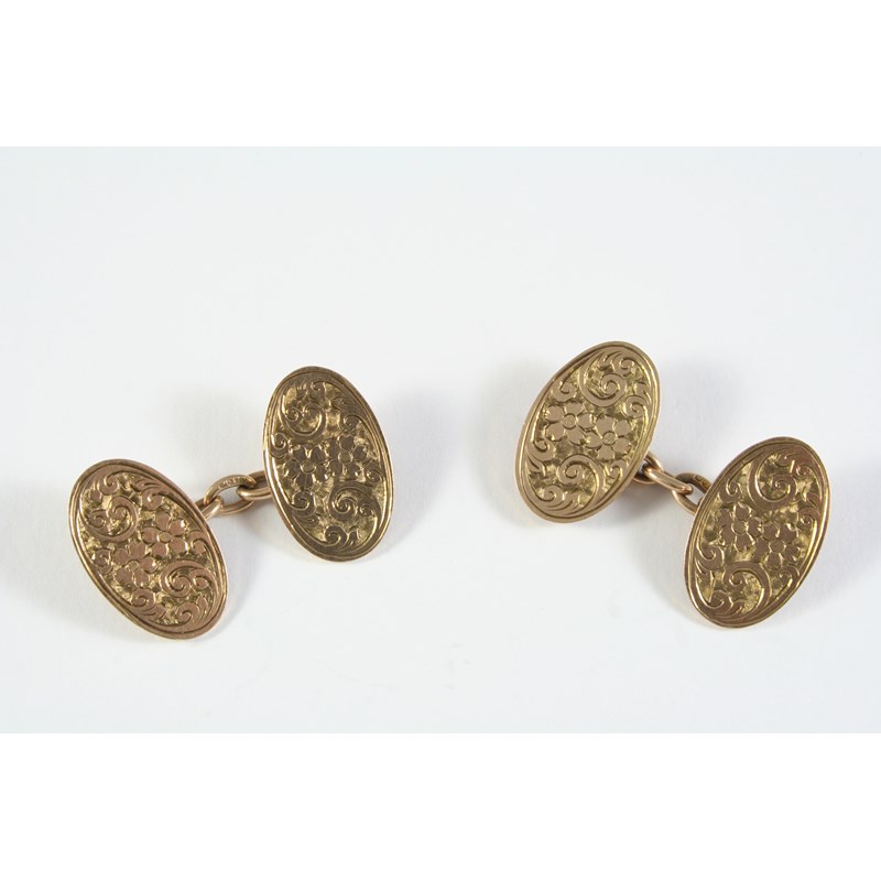 A PAIR OF 9CT GOLD CUFFLINKS of oval shape, each link with engraved foliate decoration, hallmarked for Birmingham 1894, 8.5 grams