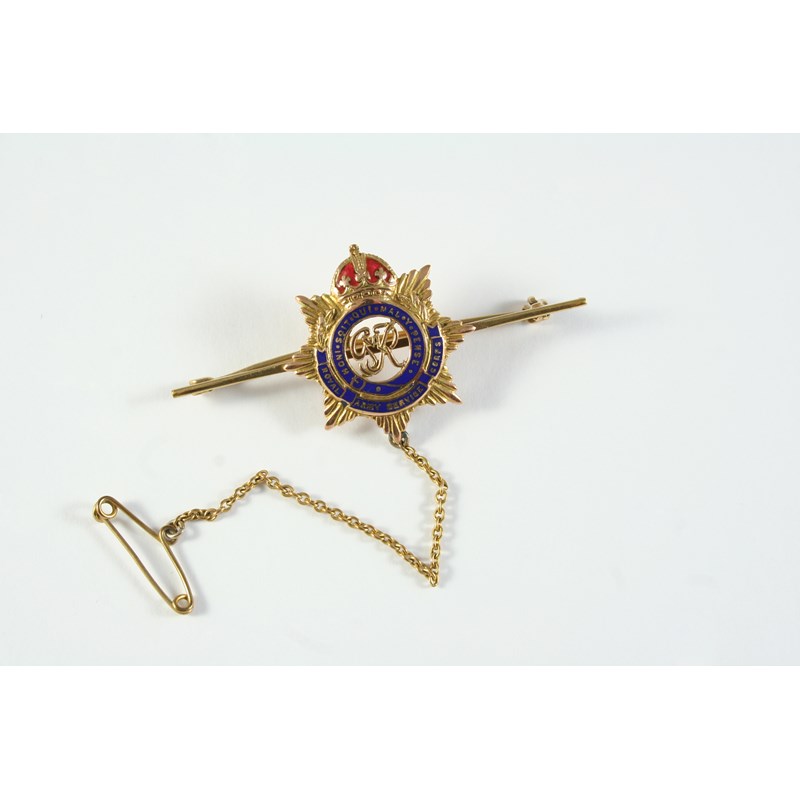 A 9CT GOLD AND ENAMEL REGIMENTAL BROOCH FOR THE ROYAL ARMY SERVICE CORPS with red and blue enamel decoration, 5cm long