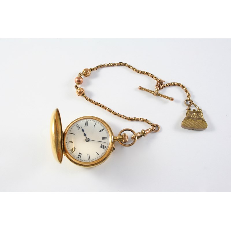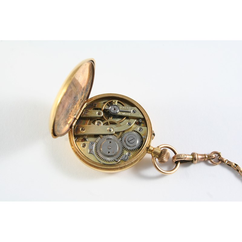 the white enamel dial with Roman numerals, with blue enamel numerals and pink enamel decoration to the chapter ring, with an inscription to the back case dated for 1913, on a 9ct gold watch chain, 18cm long, total weight 35.7 grams