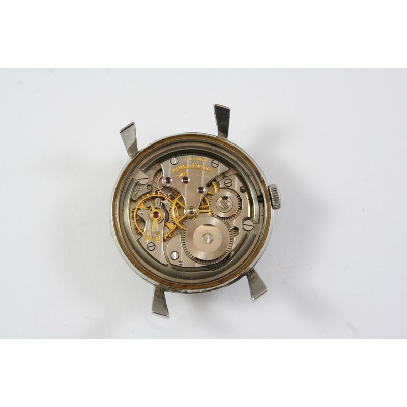 the signed circular dial with Arabic quarters and dagger numerals, subsidiary seconds hand, movement numbered 673266, engraved with initials to the reverse, 32mm dia., strap missing