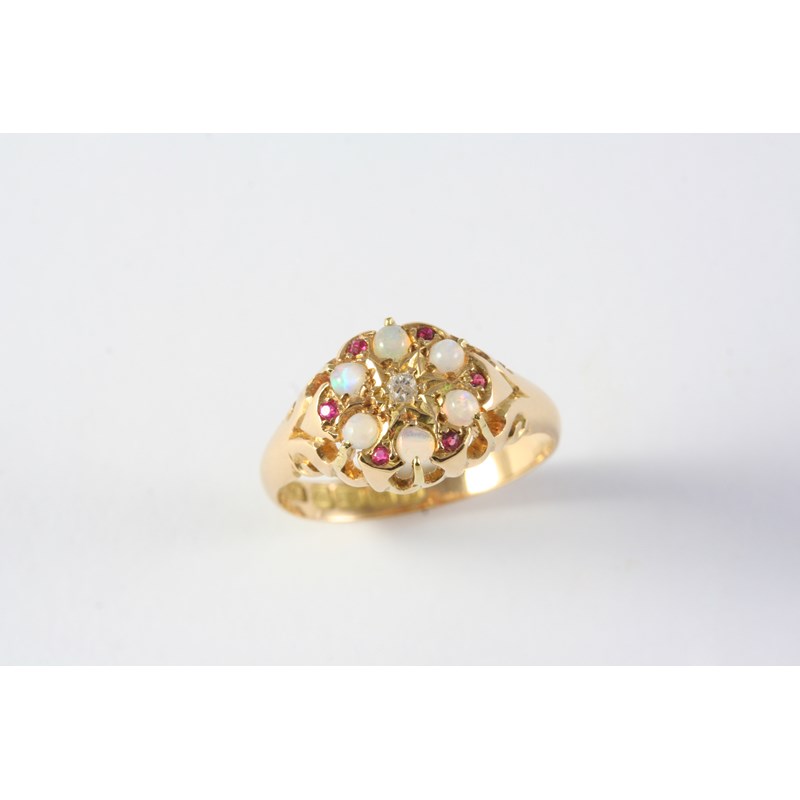 the circular-cut diamond is set within a surround of solid white opal cabochons and circular-cut rubies in 18ct gold, hallmarked for Birmingham 1914. Size K