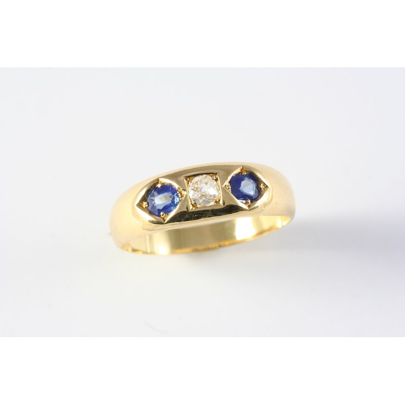 A SAPPHIRE AND DIAMOND THREE STONE RING the gold band is set with a cushion-shaped diamond and two oval-shaped sapphires. Size S