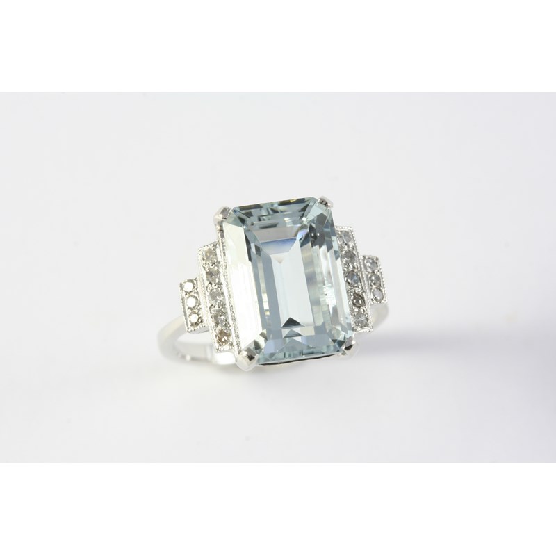 AN AQUAMARINE AND DIAMOND RING the step-cut aquamarine is set with two rows of circular-cut diamonds in platinum. Size M 1/2