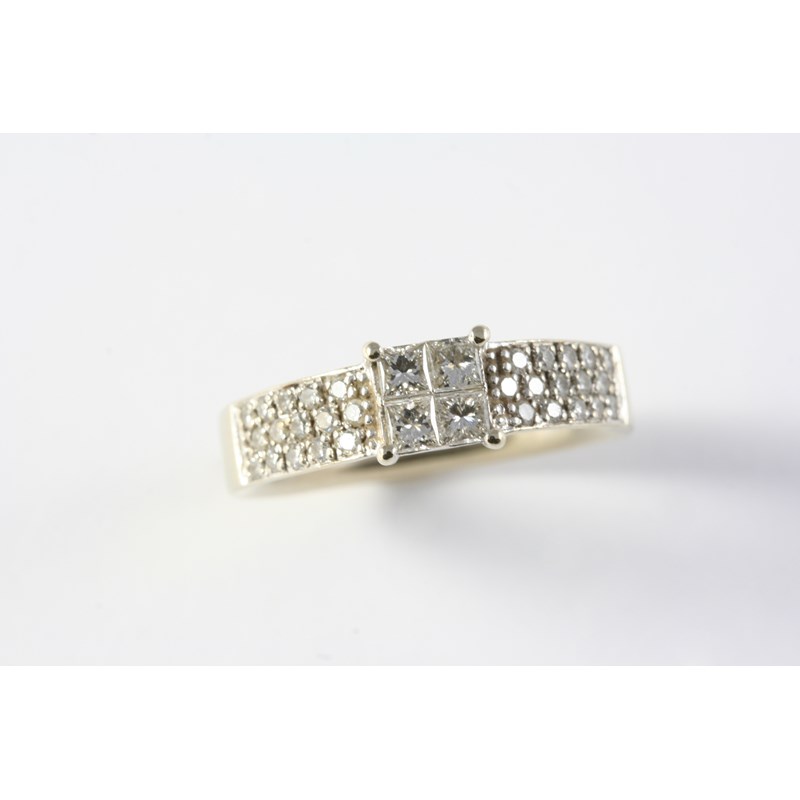 A DIAMOND RING the central four princess-cut diamonds are set with circular brilliant-cut diamonds to the shoulders, in white gold. Size O 1/2