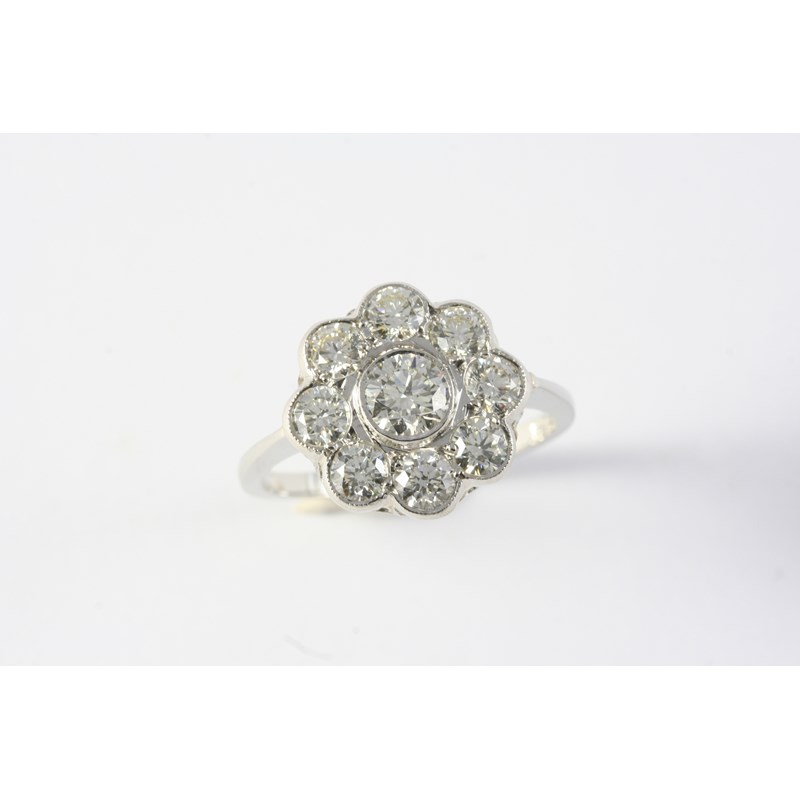 A DIAMOND CLUSTER RING of flowerhead form, set with nine circular-cut diamonds weighing approximately 1.55 carats in total, in platinum. Size O