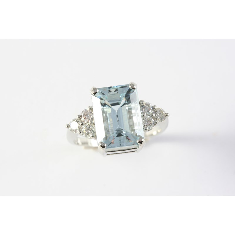 AN AQUAMARINE AND DIAMOND RING the step-cut aquamarine is set with three circular-cut diamonds to each shoulder, in platinum. Size O