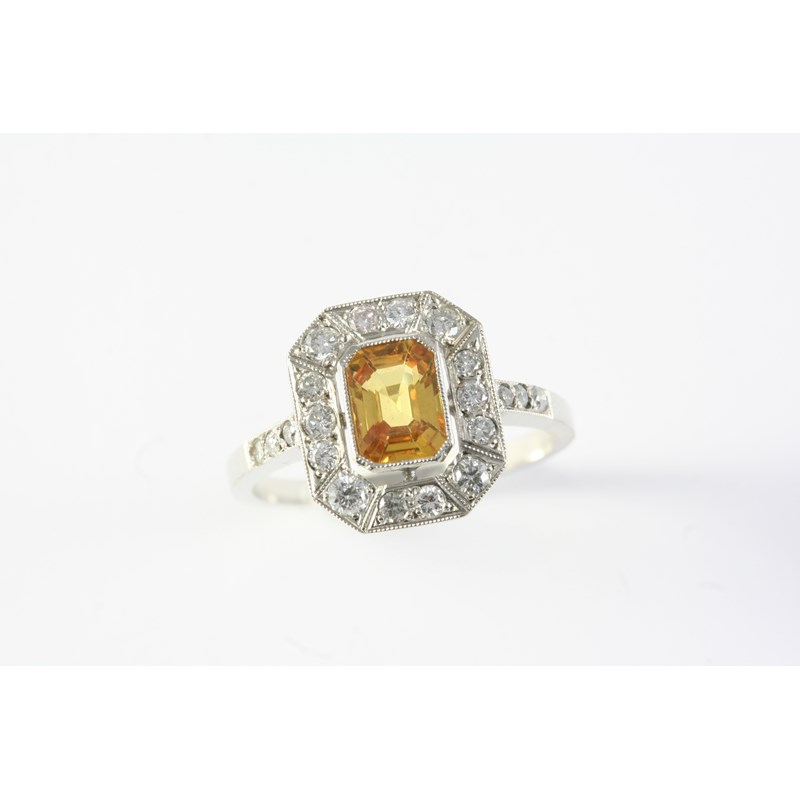 A YELLOW SAPPHIRE AND DIAMOND CLUSTER RING the cut-cornered rectangular-shaped yellow sapphire is set within a surround of circular-cut diamonds, with further diamonds set to each shoulder, in platinum. Size P