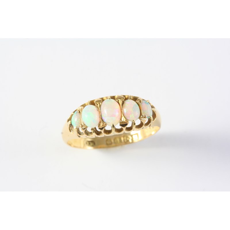 AN OPAL FIVE STONE RING the five graduated oval solid white opals are set in 18ct gold. Size L 1/2