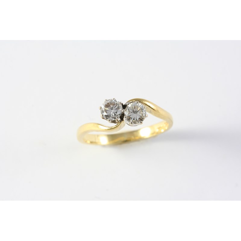 A DIAMOND CROSS-OVER RING set with two circular-cut diamonds, in 18ct gold. Size L