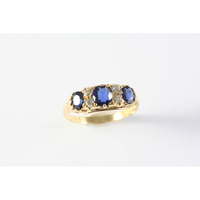 A SAPPHIRE AND DIAMOND RING the three circular-cut sapphires are set with four circular-cut diamonds, in yellow gold. Size M