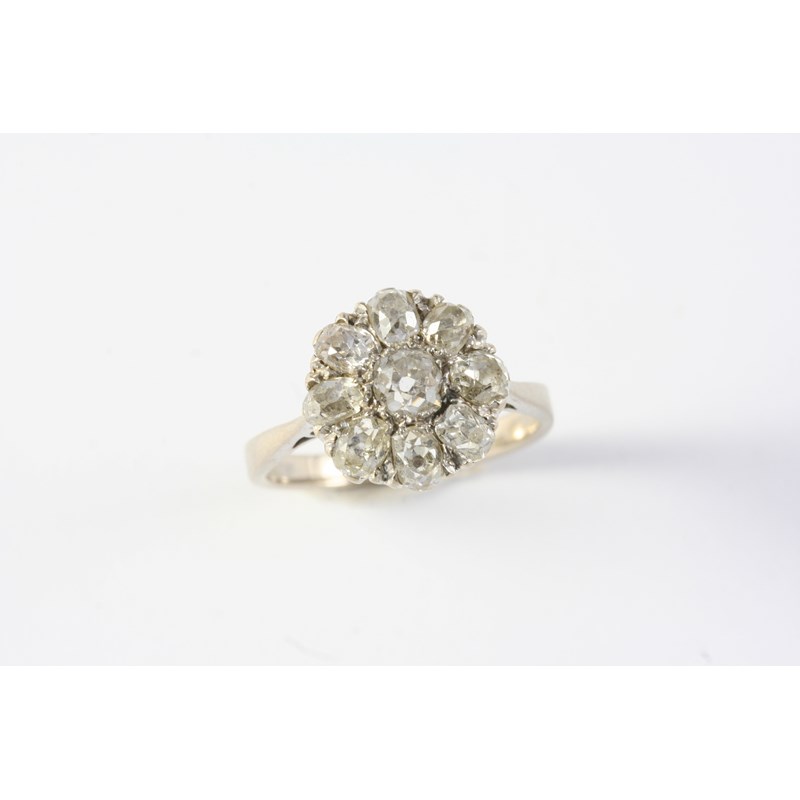 A DIAMOND CLUSTER RING the old cushion-shaped diamond is set within a surround of eight old cushion-shaped diamonds, in 18ct white gold. Size L