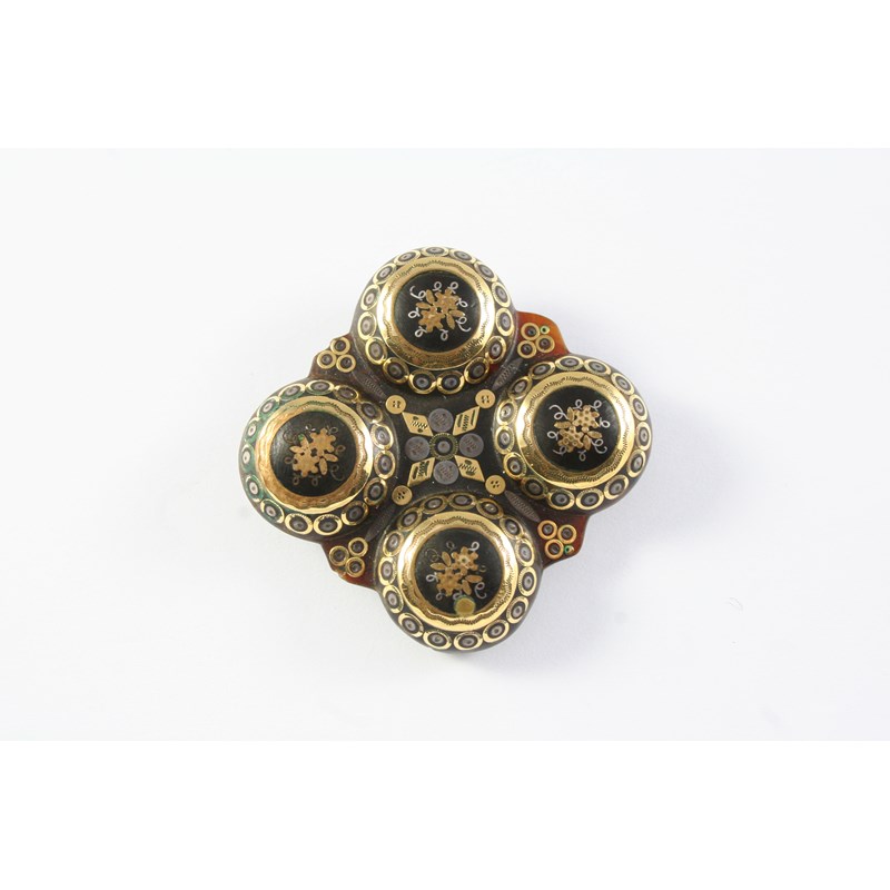A PIQUE BROOCH of quatrafoil form, the tortoiseshell brooch is inlaid with gold decoration, 4.5cm wide