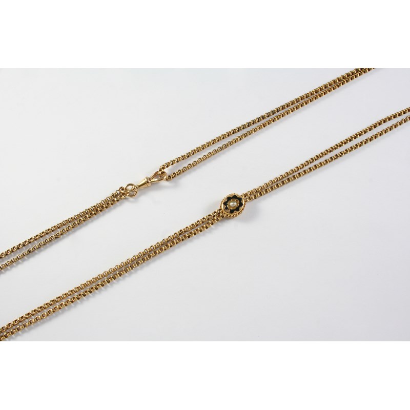 A VICTORIAN GOLD AND ENAMEL MUFF CHAIN formed with triple circular links, with a gold slide, mounted with a half pearl and black enamel decoration, 82cm long, 39.6 grams
