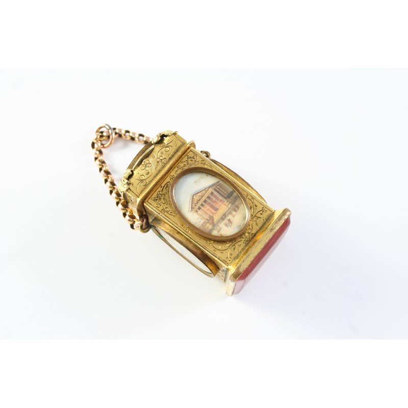 A GILT METAL SCENT BOTTLE of rectangular shape, with engraved foliate decoration, the sides and the top depicting Parisian scenes, 4cm long