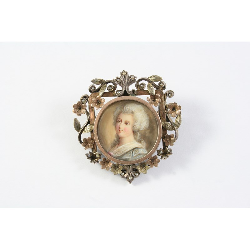 depicting the head and shoulders of a woman in a blue dress with white collar, in an ornate foliate frame, 3.5cm wide