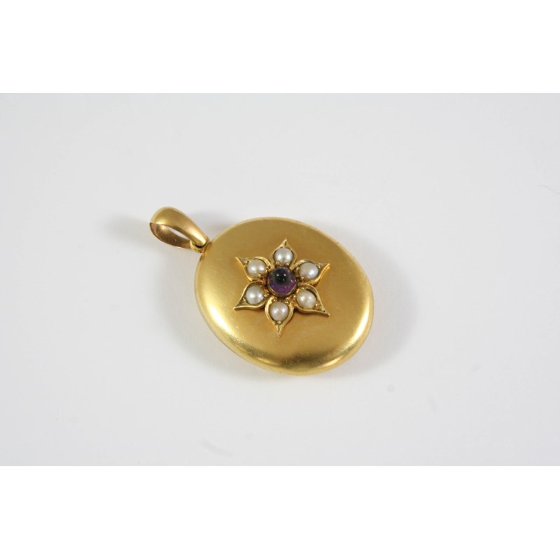 A VICTORIAN GOLD, AMETHYST AND PEARL SET LOCKET PENDANT
