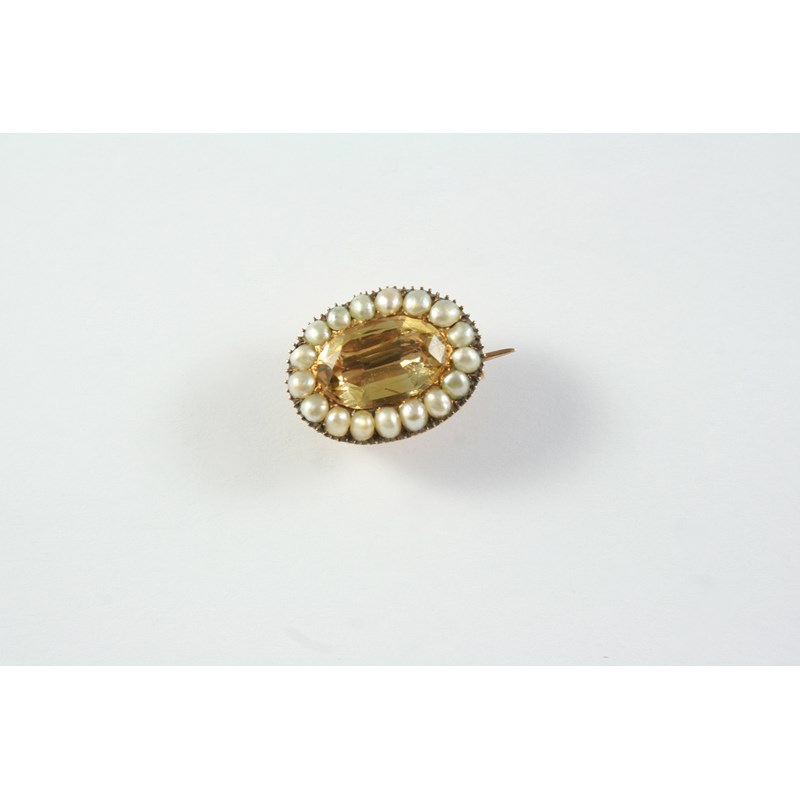 A GEORGIAN TOPAZ AND PEARL SET BROOCH the oval-shaped foil backed topaz is set within a surround of half pearls, in gold, 2.1cm wide
