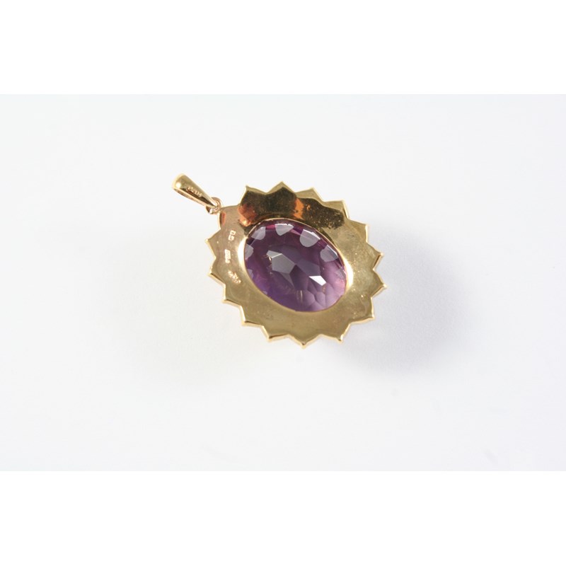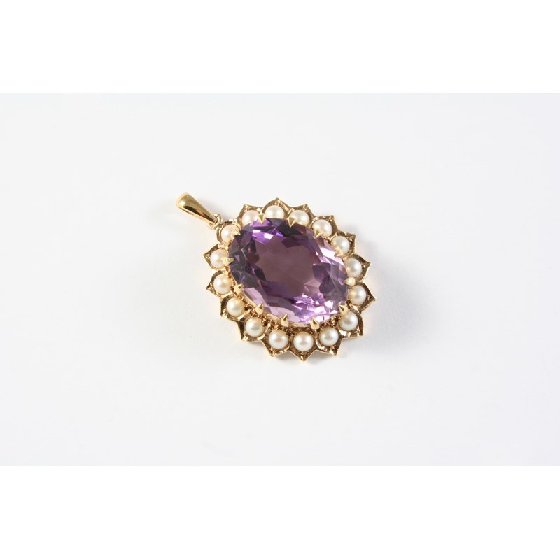 AN AMETHYST AND PEARL CLUSTER PENDANT the oval-shaped amethyst is set within a surround of half pearls in gold, 2.5cm long