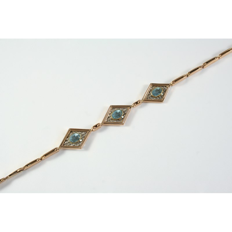 AN EARLY 20TH CENTURY AQUAMARINE AND GOLD BRACELET formed with three oval-shaped aquamarines in openwork mounts, on a 15ct. gold flexible bracelet, 20cm long